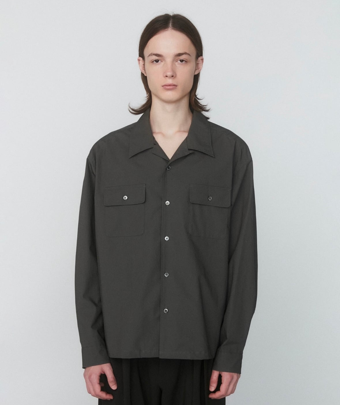 オーガニックコンパクト糸を使用したオープンカラーシャツ。 ミリタリージャケットを上品な生地で清涼感のある 開襟シャツに仕上げました。 肘にはミリタリーアイテムに見られるタックが入ります。 裾はフラットでワイドなシルエットに仕上げております。