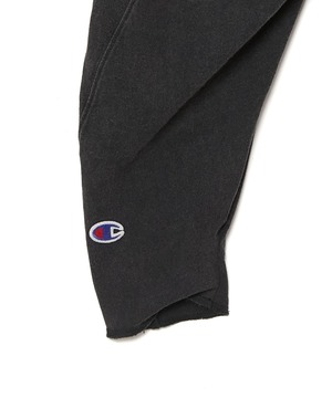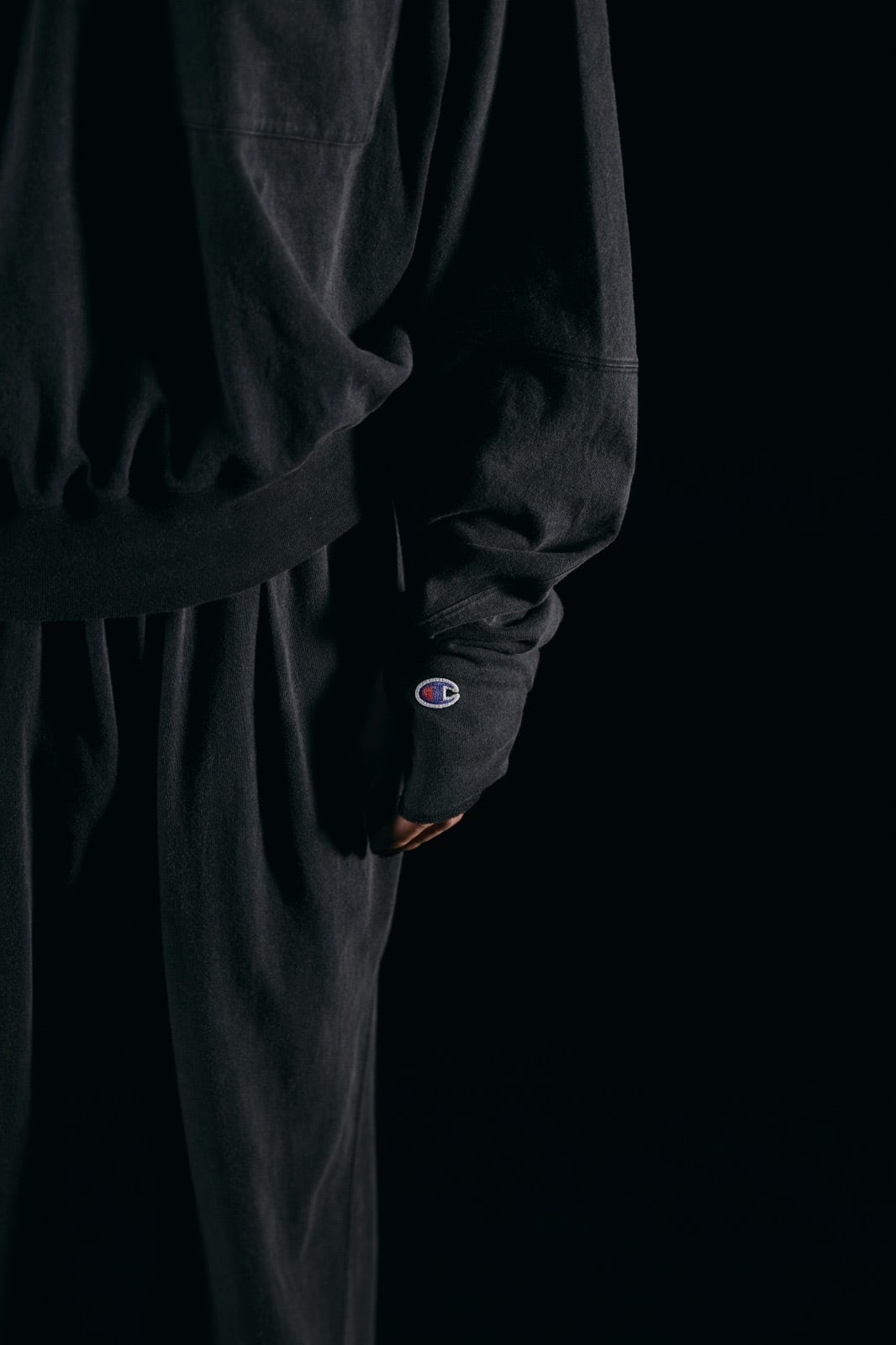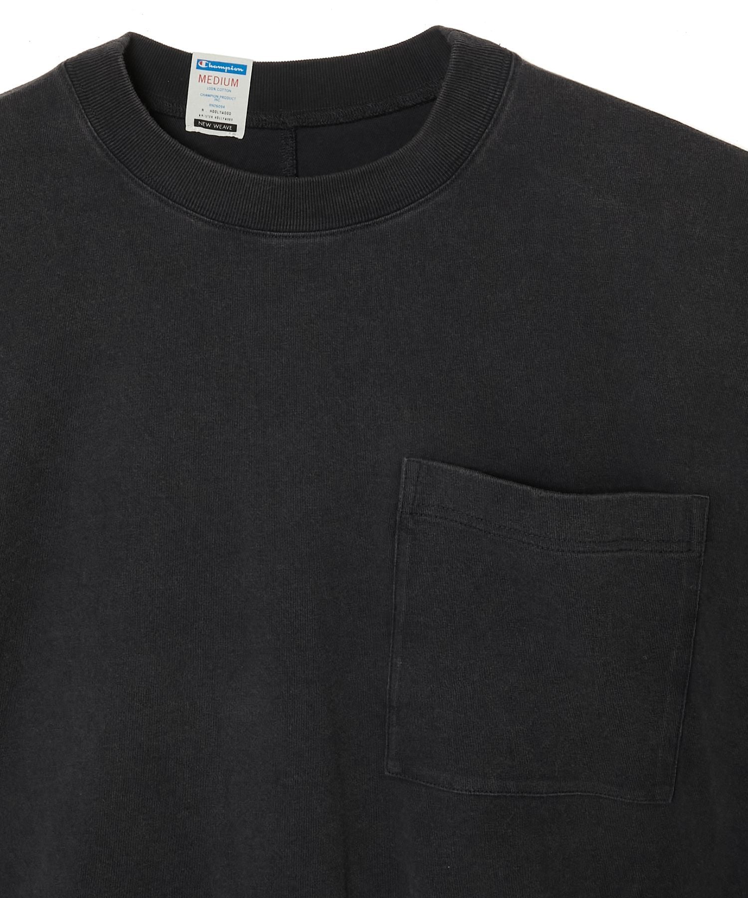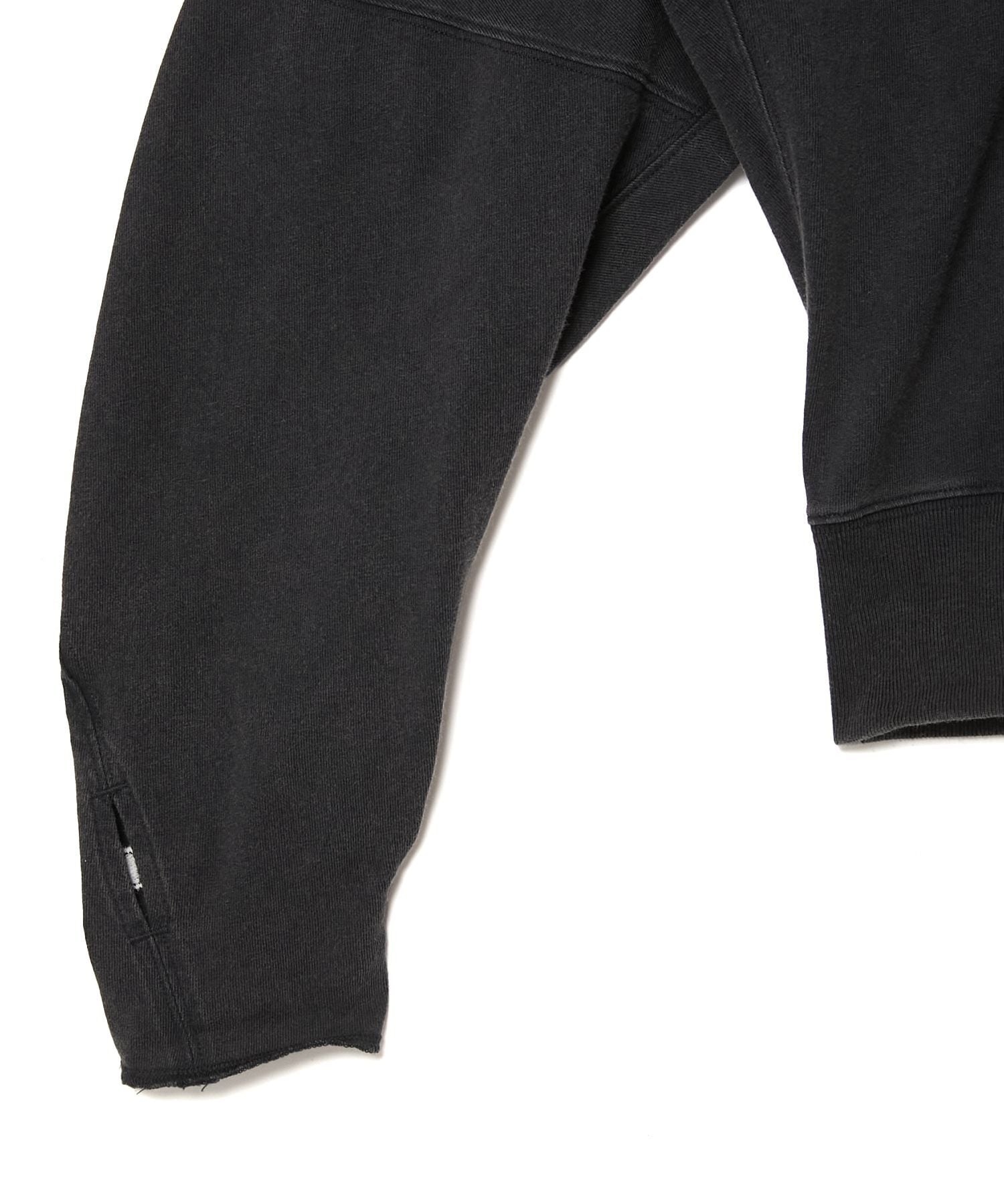 ・立体裁断により身体に沿う設計。前身頃からスリーブを通り、後身頃まで一枚の生地で製作。 内側に入り込むように丸みのあるフォルムのスリーブ。シームポケット付き。裾のリブはテンションを強めに設定。袖口はロック始末でスリーブが捻れるように配置したフィンガーホール付き。両袖にChampionのCロゴを配置。N.HOOLYWOODのタグに Championのロゴが入ったNEW WEAVE専用タグを製作。