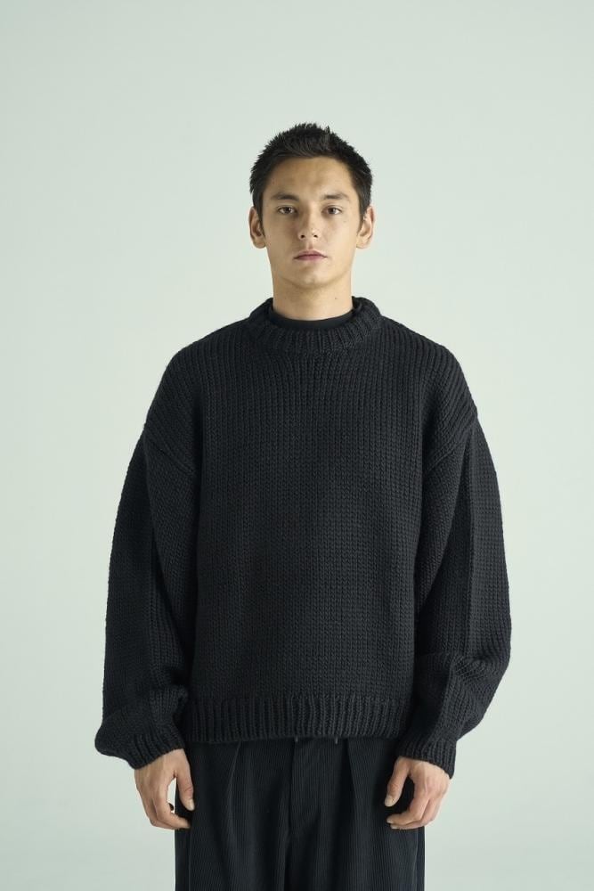 ウール100%で作られており、その自然な温かさと柔らかな質感が特徴です。ウールの特性である保温性や通気性を活かし、寒い季節にも快適に着用できるアイテムです。さらに、1ゲージという太めの糸を使用することで、しっかりとした密度感と立体感が生まれ、編み目が際立つデザインになっています。ドロップショルダーとボリュームのある袖を加えることで、さらにリラックス感とトレンド感を強調し、スタイリッシュでありながらも温かみのある印象を与えます。