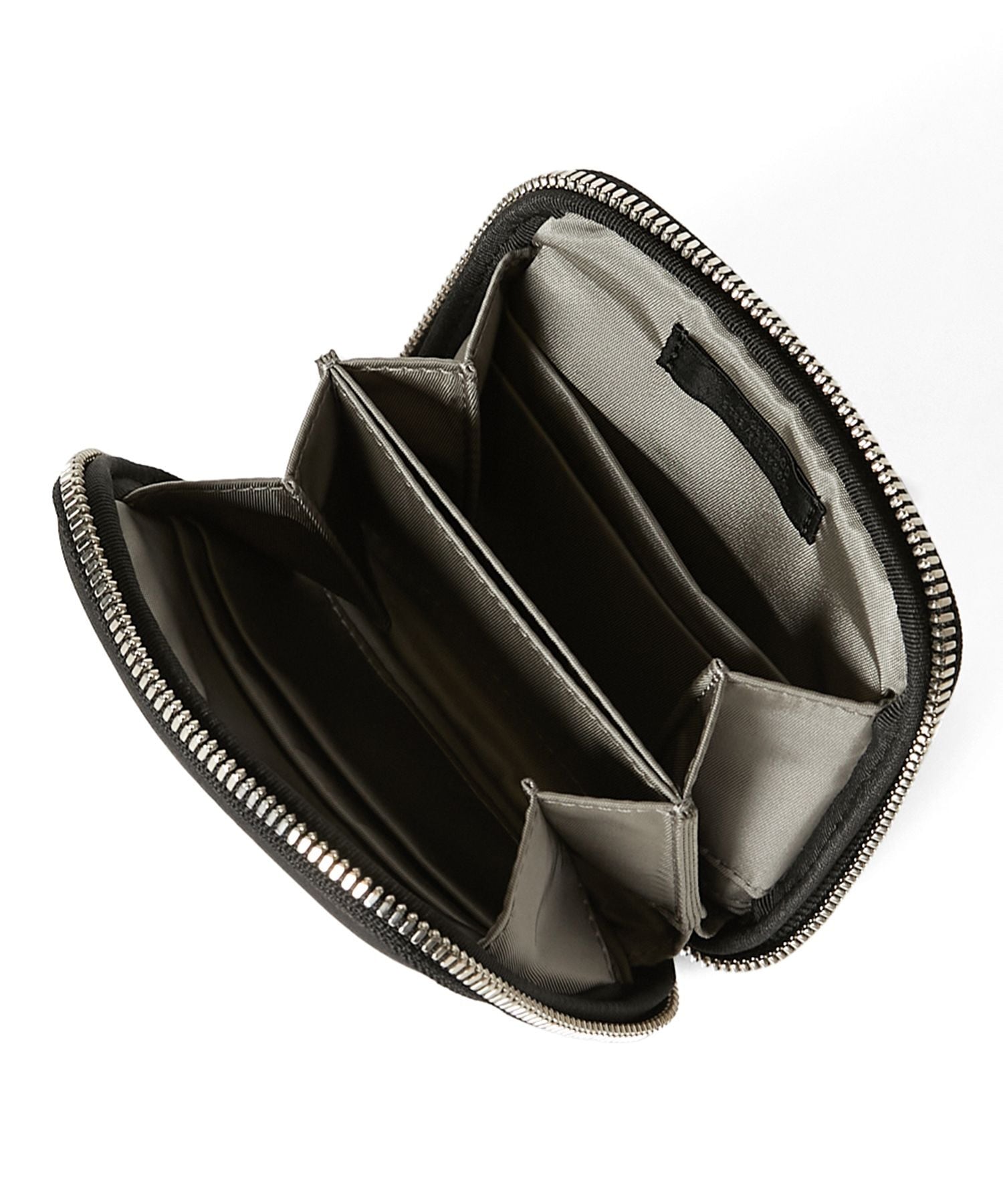 ・ファスナーの引き手はオリジナルを製作。生地張りの内装は、両サイドにカードケースを備え、真ん中には小銭など細かなものを収納するのに便利なポケット付き。ウレタンを内蔵することで柔らかい印象に。フロントにはシルバーの箔押しでロゴをプリント。