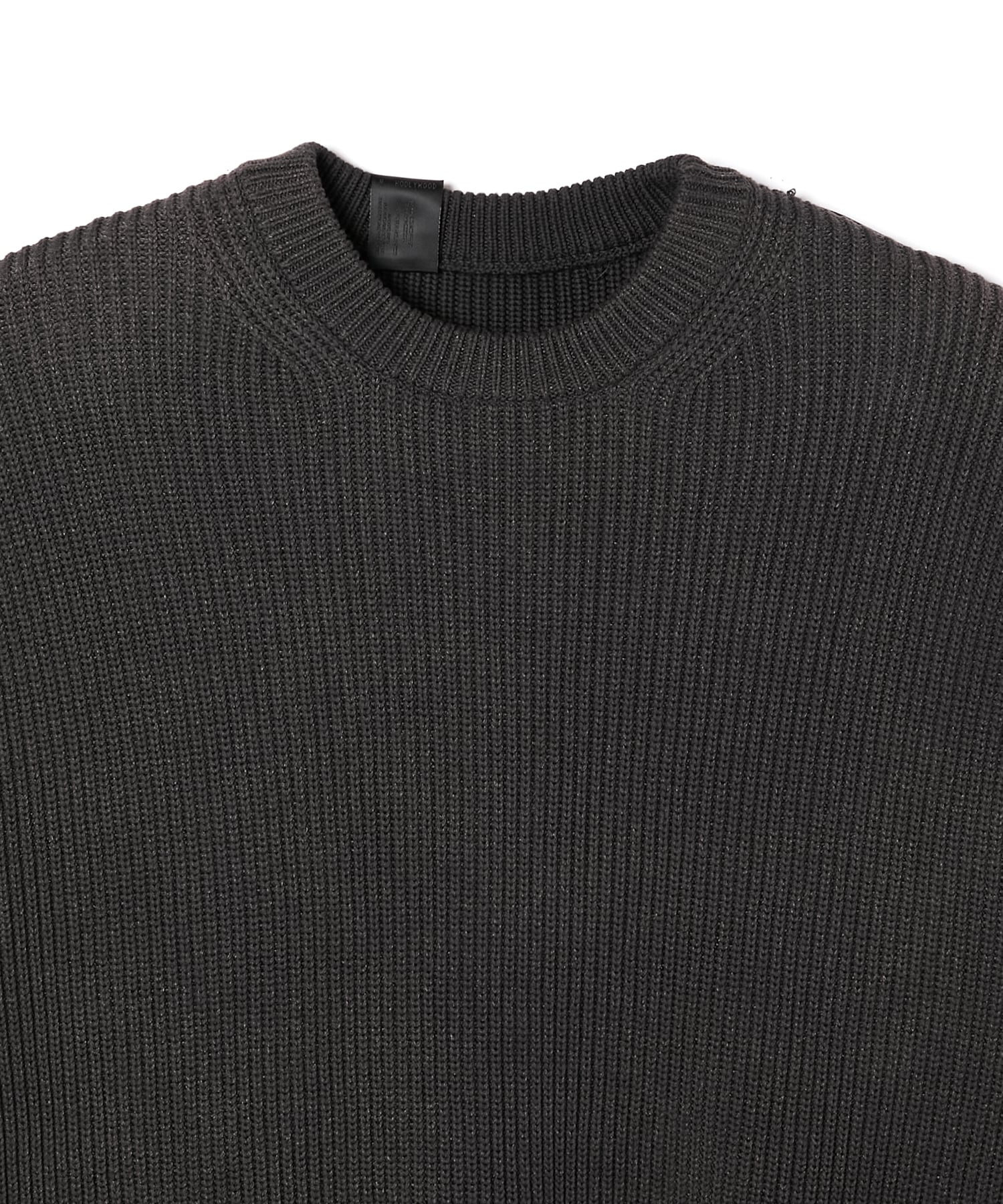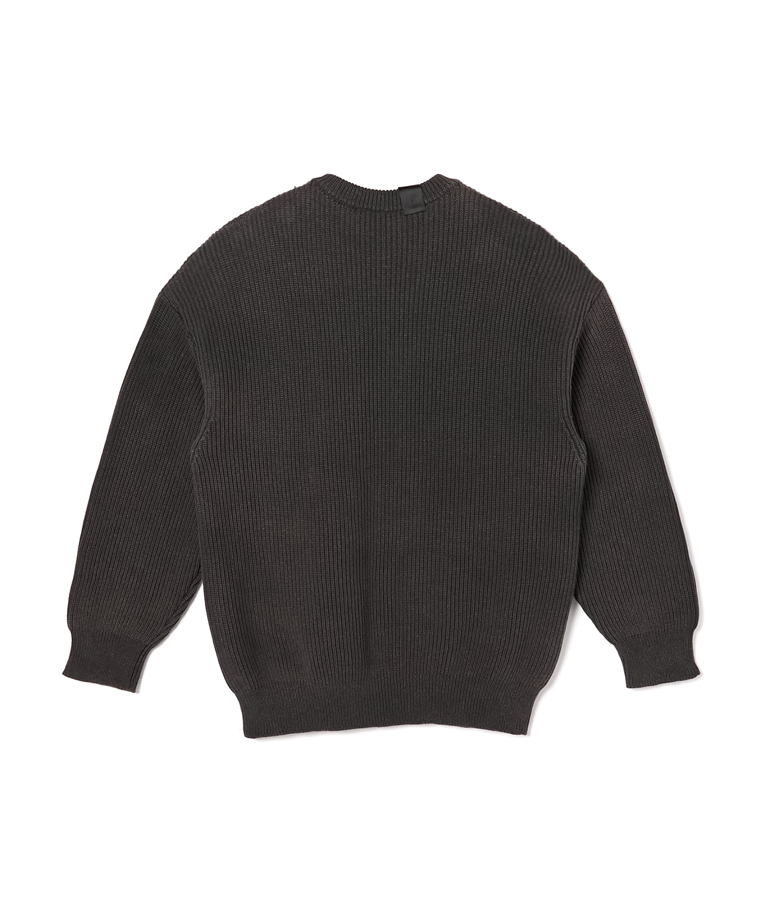 ・コンパクトヤーンを使用した天竺素材。手作業でのミストブリーチを吹き付け、色褪せ感をプラス。ざっくりした凹凸ある畦編みにフェード感を施す事で、より奥行きある表情を演出。