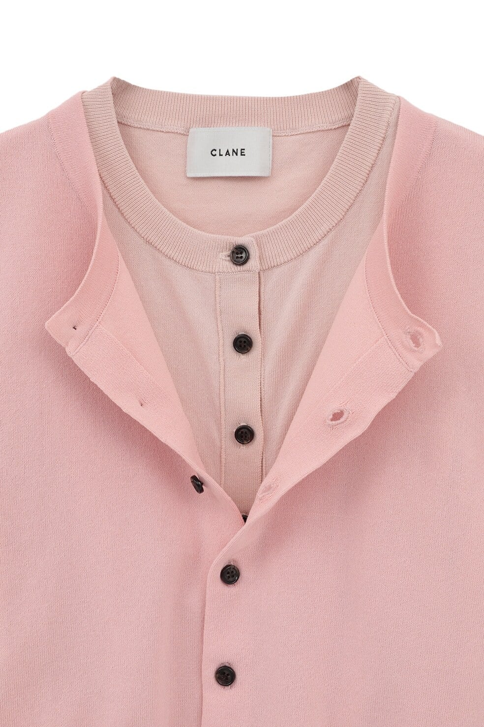 内側はベスト、外側はカーディガンをニットならではのテクニックで編み続きにし、ドッキングさせたレイヤーデザインが特徴です。