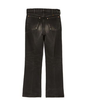 ・本来のディテールを踏襲しながら、ややゆとりのある微フレアのシルエットにアレンジ。ポケットはスラッシュポケットに変更し、ソリッドな印象に。ヒップポケットには、経年で剥がれ落ちたレザーパッチの跡を再現。センターにはクリースライン入り。ウエストのサイドにN.HOOLYWOOD COMPILEのアイコンであるブラックのブランドネームを配置。