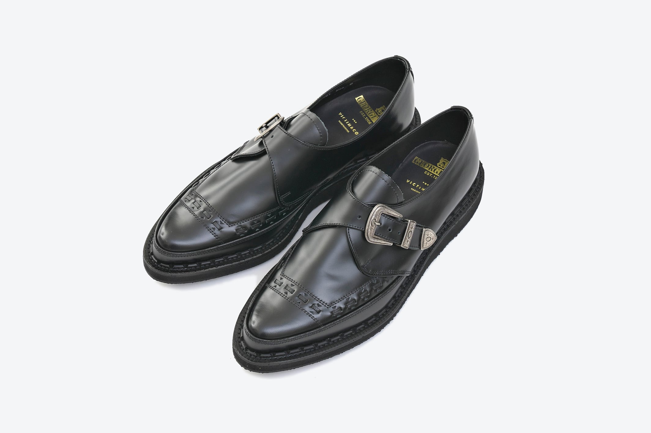 イギリスのGEORGE COXに別注したレザーシューズ。現在生産終了しているモデルを弊社で復刻再現させていただきました。シャープな見た目と甲上部分のデザインのアクセント、ベルトバックルが特徴のモデルで、ベルトバックルにはメタルバックルを使用しており、スタイリングのアクセントにお使い頂けます。ソールには柔らかく軽量でクッション性も高く、劣化がし難いEVAソールを採用しております。尚、ソールの張り替えも可能となっております。