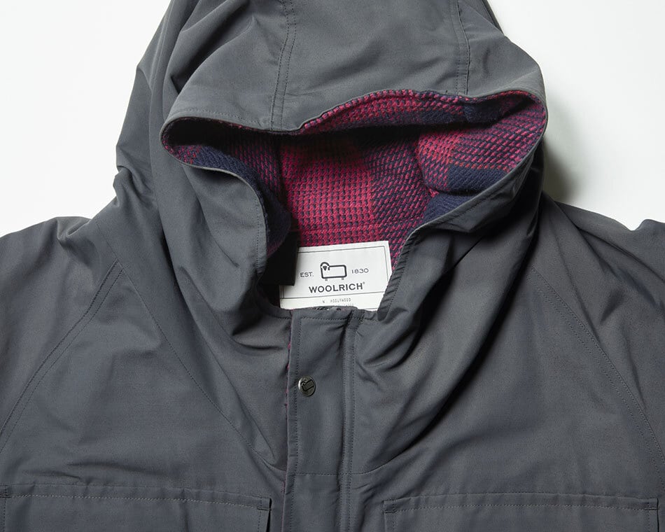 ・袖や身幅のボリュームをアップ、ネック周りは余裕を持たせ、フードやフロントのフラップポケットはサイズを大きく変更。フロントはWOOLRICHのロゴ入りオリジナルファスナーと、当時使用されていたマークのドットボタンを採用。袖はベルクロ付き、裾に配したスピンドルはデザイナーが過去にリメイクした私物のヴィンテージを模したデザイン。フード、ウエストに配したヘリンボーンテープにはレザーのスピンドルエンド付き。